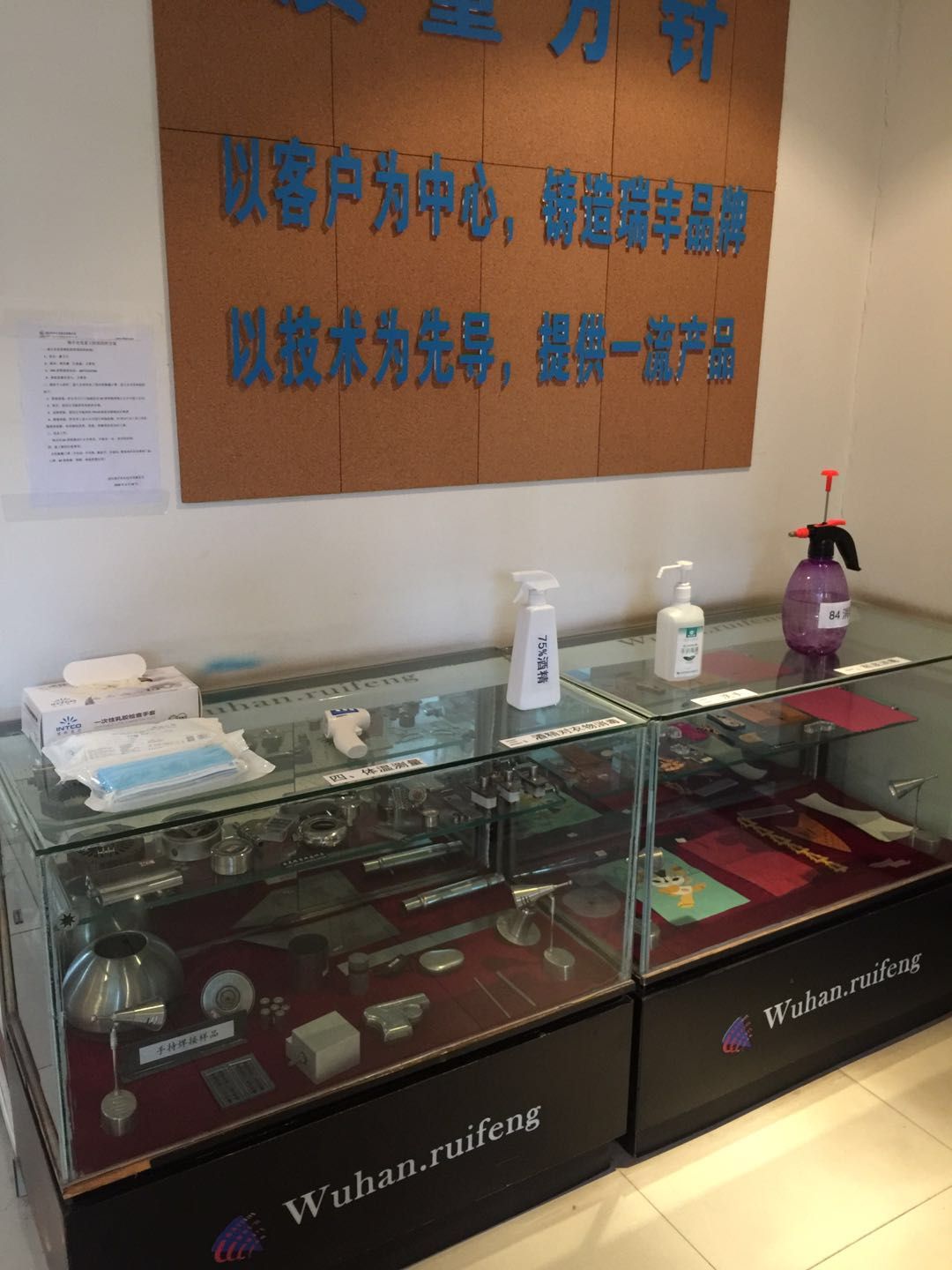 公司準備了充足的防疫物資:消毒水、酒精、口罩、體溫槍、手套等。