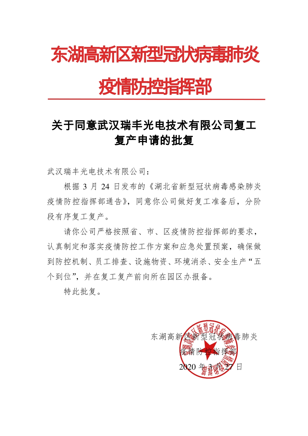 在萬眾一心抗擊疫情的非常時期,堅決貫徹黨中央重要決策部署,認真落實省、市會議精神及上級工作要求,隨著新型冠狀病毒肺炎疫情防控工作的進展,疫情的控制也逐漸走向明朗的方向, 武漢瑞豐光電技術有限公司也快速響應防疫管控號召,在通過審批后,于2020年3月30日起正式復工。